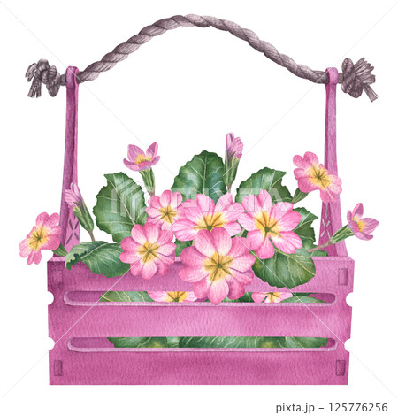 Pink primula flowers with green leaves and buds in wooden box. Hand drawn watercolor botanical illustration with primrose on isolated background. Can be use as print, poster, sticker, label