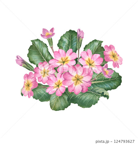 Pink primula flowers with green leaves and buds. Hand drawn watercolor botanical illustration with primrose on isolated background. Can be use as print, poster, sticker, element design, tattoo, label