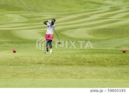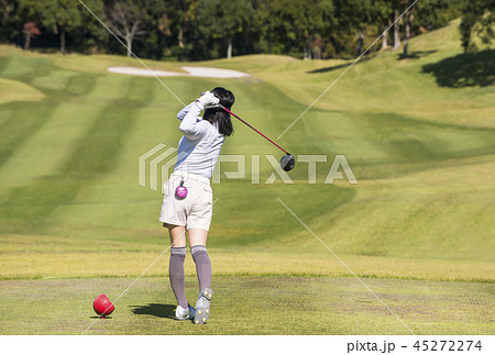 サウスポーの女子プレイヤー ティーショット ゴルフコース イメージ素材