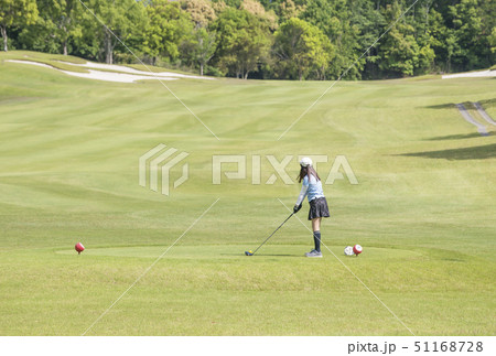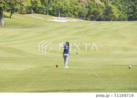 女子ゴルファー ゴルフ場コース ティーショットする女性 イメージ素材