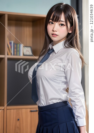 パツパツの白いシャツに紺色のスカートとネクタイ。ブラウンのロングヘアが肩にかかった巨乳の女性