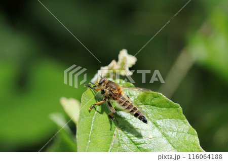 明るい日光の元、森の青葉上にシオヤアブの雌(自然光&ストロボ・マクロレンズ接写)