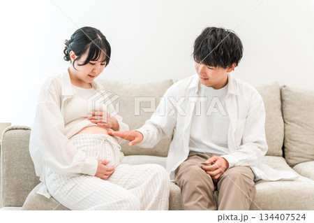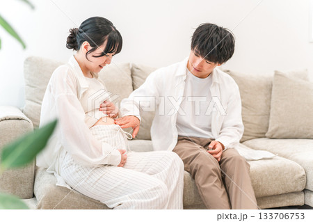 マイホームのリビングソファーで妊婦のお腹を触る男性(家族・パパ)