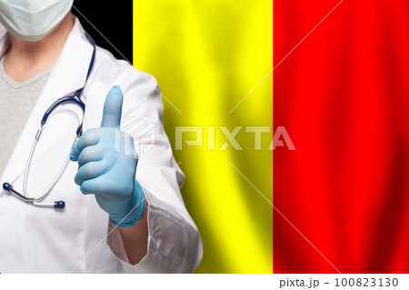 Belgian doctor's hand showing thumb up positive gesture on flag of Belgium background