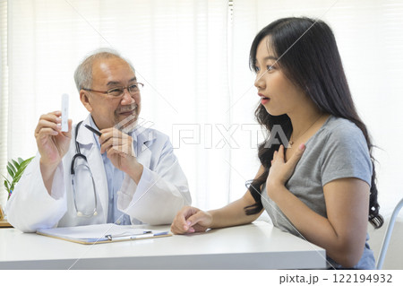 Young asian woman doctor consulting asian worried patient patient on room in hospital, friendly female physician practitioner talking, giving recommendation, discussing checkup or symptoms
