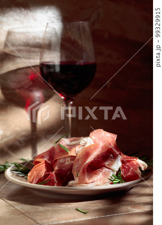 Spanish sliced pork jamon with red wine