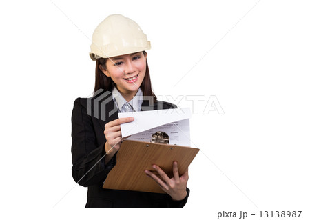 Women engineer with safety helmet reading her files