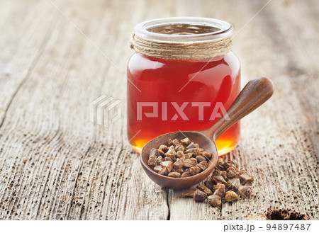 Propolis granules in a wooden spoon. Bee glue. Bee
