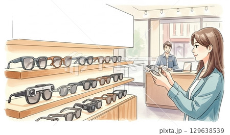 スマートグラス売り場で接客を受ける女性(水彩風イラスト)