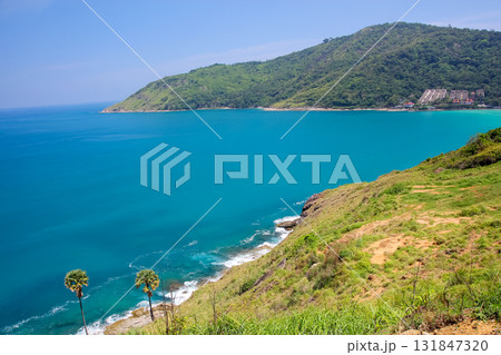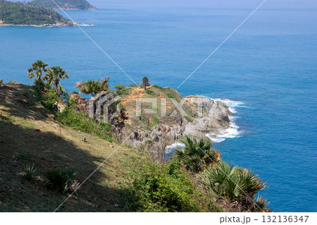 Promthep Cape is one of the most photographed locations in Phuket. Phromthep cape viewpoint at blue sea sky in Phuket, Thailand.