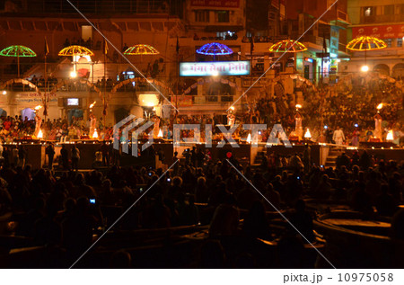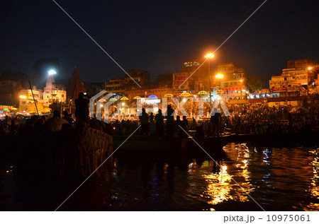 裕福な信者は陸上で、他は船で鑑賞するバナーラスのプージャ