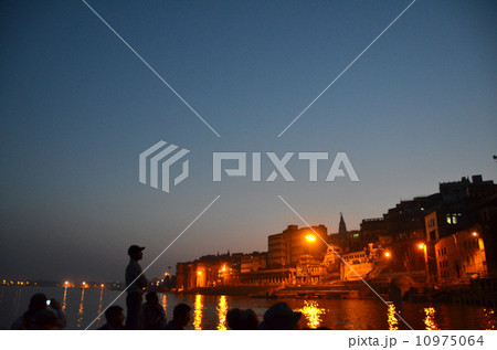 ガンジス川の畔のバナーラスで日没の祈りプージャを待つ人々