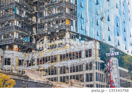14.10,2022 - UKRAINE. KYIV. Russia's military aggression against Ukraine. Business center 101 TOWER civilian facility after a missile airstrike by russian troops in the Kyiv, Ukrainian capital
