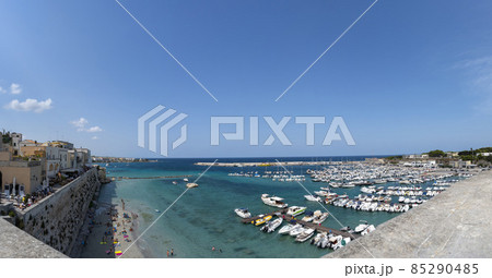 Otranto, Puglia, Italy. August 2021. Amazing view from the top of a panoramic point over the town: the gaze passes from the town to the sea and the marina in this large panoramic format photo.