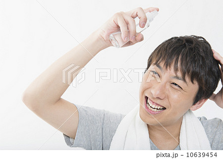 AGA 男性型脱毛症の男性、育毛剤を頭に振りかける