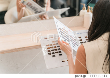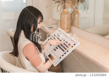美容室・ヘアサロン・美容院でヘアカラーサンプルを見てカラーを選ぶ女性