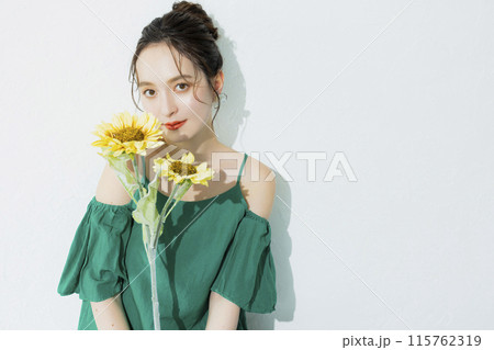 ひまわりを持った女性