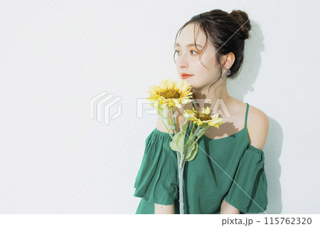 ひまわりを持った女性