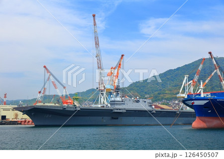 【広島県】晴天の海上自衛隊 呉基地に停泊する大型護衛艦 かが