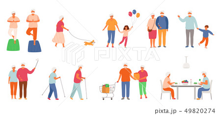 Set of active lifestyle seniors. Elderly people characters. Old people eat healthy food, do yoga