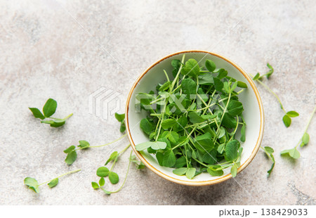 Green pea shoots in bowl, healthy microgreens for fresh eating