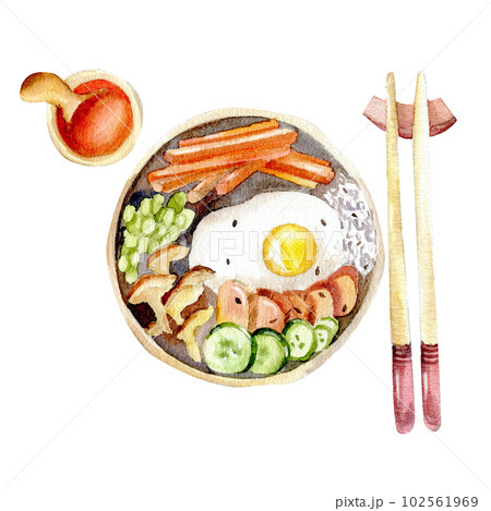 Asian traditional bowl. Watercolor tai, japanese food illustration set : chili sause, bowl with rice, mushrooms, carrot, meat, cucumber, egg , beans. Chopsticks