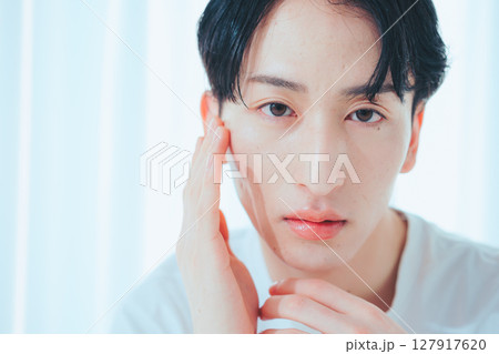 透明感のある肌をもつ若い日本人男性のポートレート(白背景)