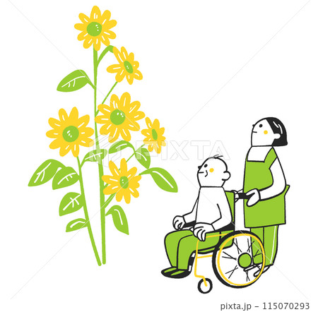 大きくのびのびと育った大輪のひまわりを見上げる車椅子の老人と介護者 イラスト素材
