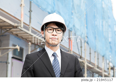 ビルの前にヘルメットをかぶって立つ作業服姿の若い男性