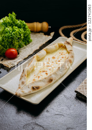 Turkish cheese pide with melted mozzarella on a plate in elegant and traditional food presentation
