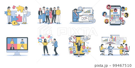 Diverse business settings with professional characters illustration set