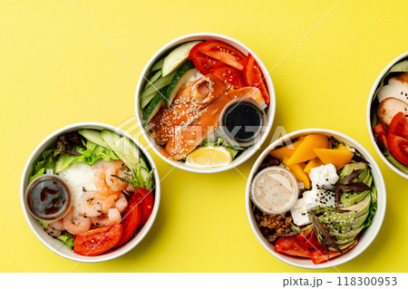 Top view of fresh poke bowls on yellow background