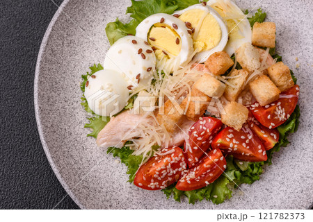 Delicious fresh salad with lettuce, croutons, chicken fillet, tomatoes and egg