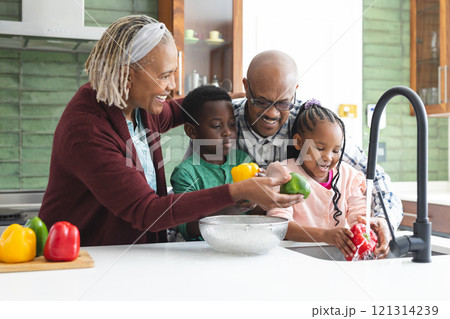 Happy african american grandparents and grandchildren washing vegetables in kitchen, slow motion