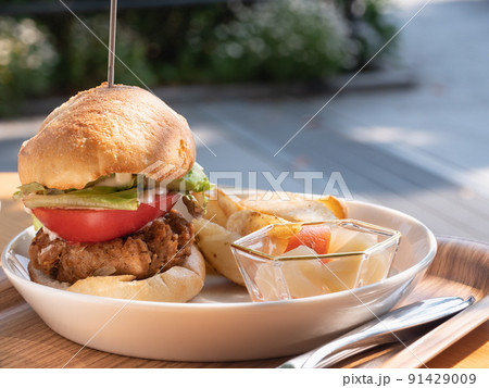 大豆ミートハンバーガー。アボカドとトマトを挟んだヘルシーなバーガー。