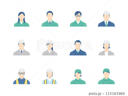 現場とオフィスで働く男女のアイコンセット。作業服を着た人物のイラスト素材。