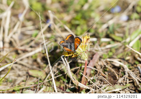セイヨウタンポポの花で吸蜜するベニシジミ春型
