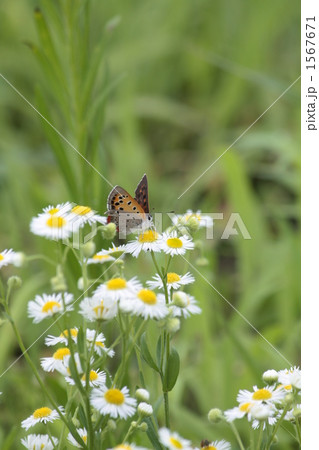 ヒメジョオンの花で吸蜜するシジミチョウ科ベニシジミ