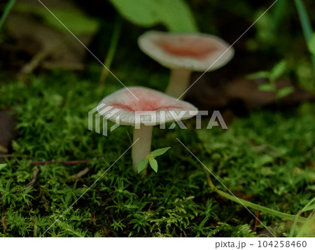 苔生える林内の土壌に一本のピンクと白色のベニタケ属キノコ(自然環境下菌・キノコ類マクロ撮影)