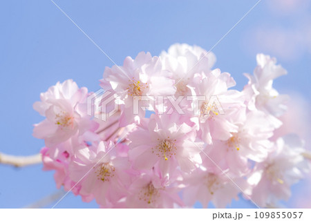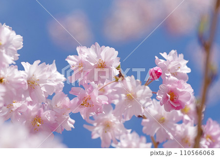 青空に映えるピンクの桜「ヤエベニシダレ」