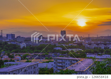 多摩よこやまの道から見た夕焼けに染まる多摩ニュータウンの写真