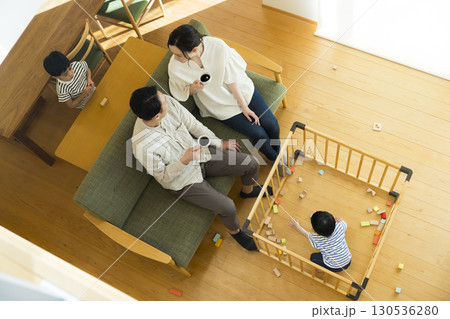 リビングでくつろぐ4人家族_俯瞰