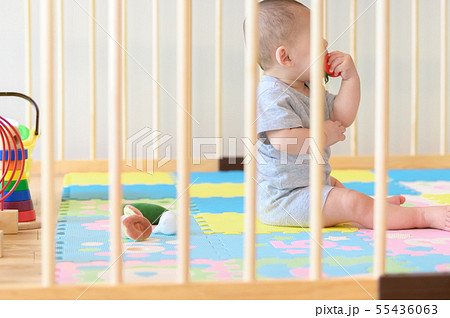 ベビーサークルで遊ぶ乳児
