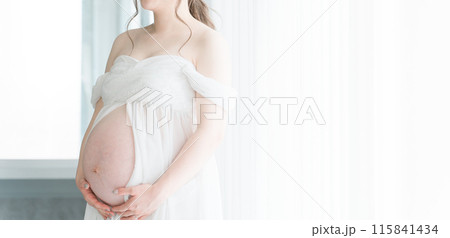 家のカーテンの前でマタニティフォトの撮影をする妊婦のアジア人女性