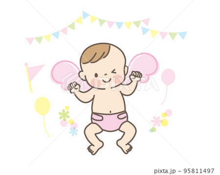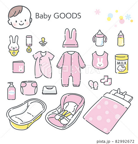 笑顔の赤ちゃんとベビー用品のイラスト素材セット
