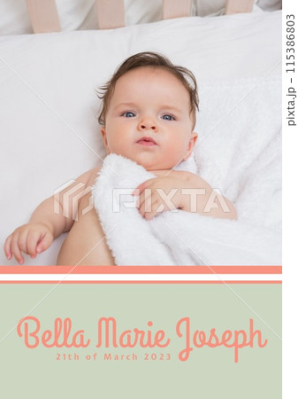 Composition of bella marie joseph text with birth date over caucasian baby on beige background