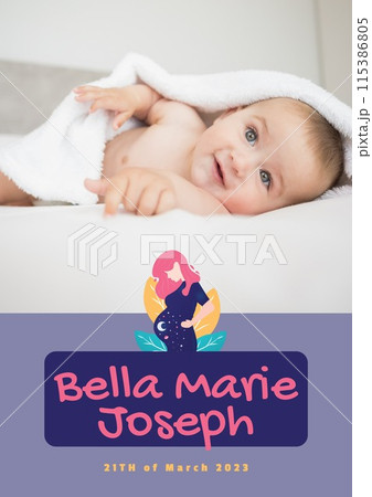 Composition of bella marie joseph text with birth date over caucasian baby on purple background