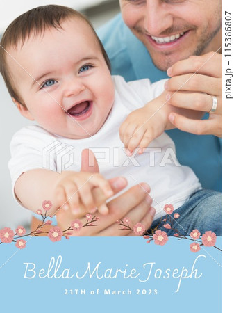 Composition of bella marie joseph text with birth date over caucasian father and baby