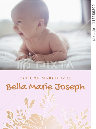 Composition of bella marie joseph text with birth date over caucasian baby on pink background