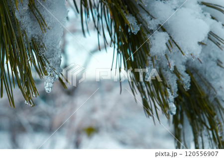 BEAUTIFUL WINTER photos with snow and icy branches with sun glare and leaves. High quality photo